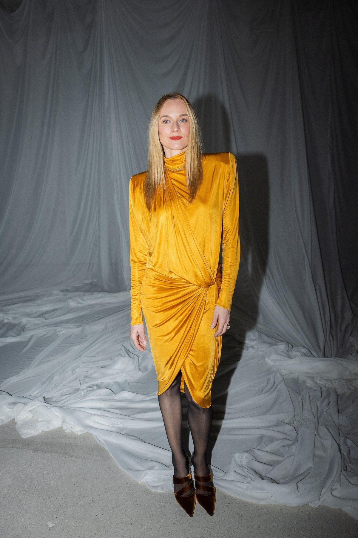 Η Diane Kruger επέλεξε ένα εντυπωσιακό πορτοκαλί φόρεμα με μεγάλες επωμίδες που διατηρούσαν την αυστηρή αρχιτεκτονική του σχήματος, παρόλο που το ύφασμα ήταν μαλακό και ρευστό. Το αποτέλεσμα ήταν ένα look που ισορροπούσε ανάμεσα στη δύναμη και τη θηλυκότητα.