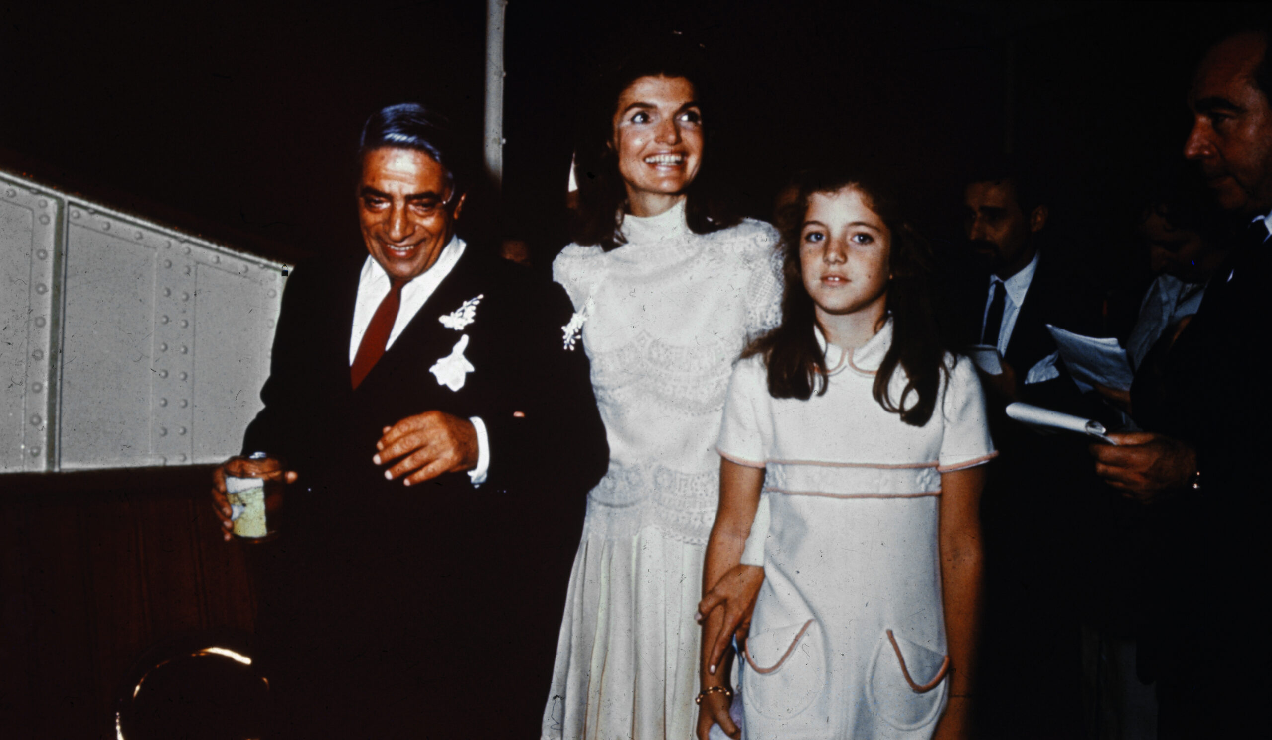 (Original Caption) Bearing traces of confetti, Mr. and Mrs. Aristotle Onassis, (Jackie Kennedy), are shown at their October 20th wedding on Onassis’ private island. Caroline Kennedy, 10, stands next to her mother.
