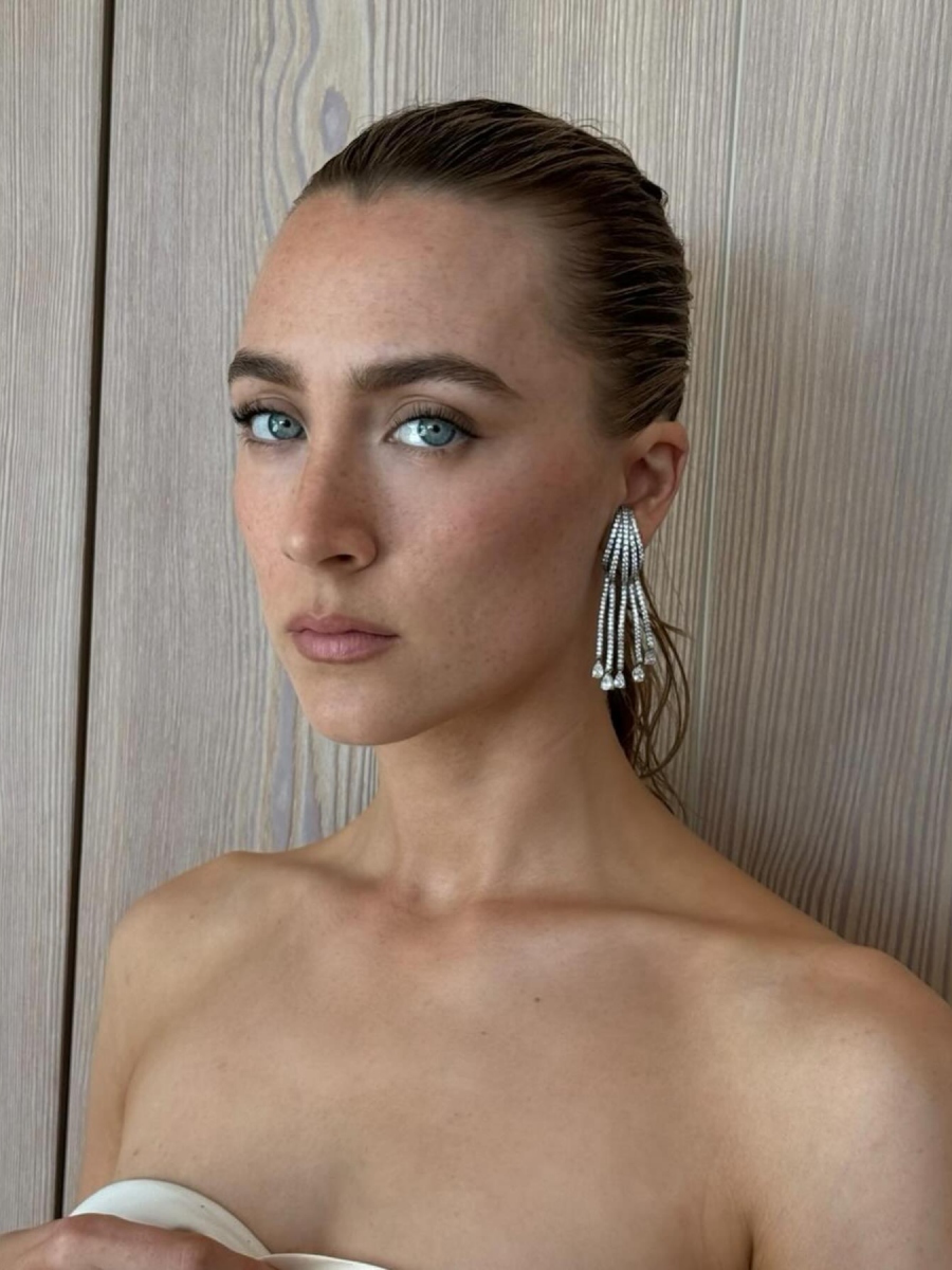 Η Saoirse Ronan σε red carpet εμφάνιση με ένα υπέροχο wet look. Τα μαλλιά της είναι όλα τραβηγμένα προς τα πίσω και πιασμένα σε bun με μια τούφα ελεύθερη και απόλυτα wet.