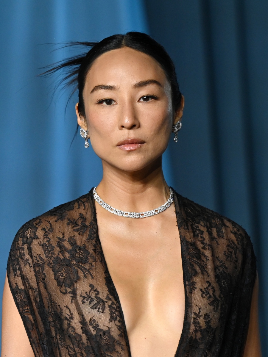 Greta Lee: Το νέο αγαπημένο fashion και beauty icon με απίθανο bun, minimal eyeliner look και λμαπερό φινίρισμα στα ροζ χείλη.