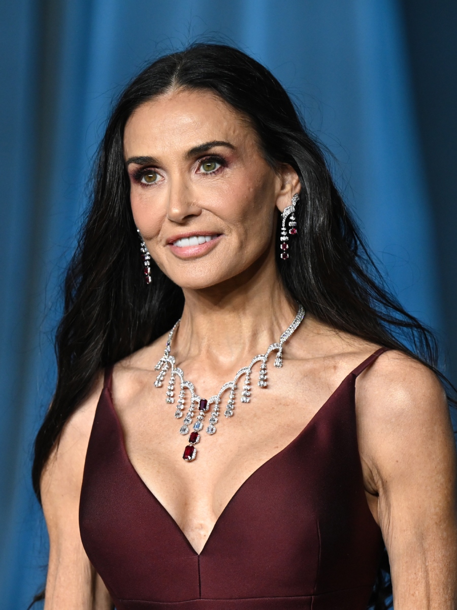 Demi Moore: Το βλέμμα της τονίζεται με την burgundy απόχρωση που έχει η Prada δημιουργία αλλά και το πολύτιμο κόσμημα στο λαιμό της.