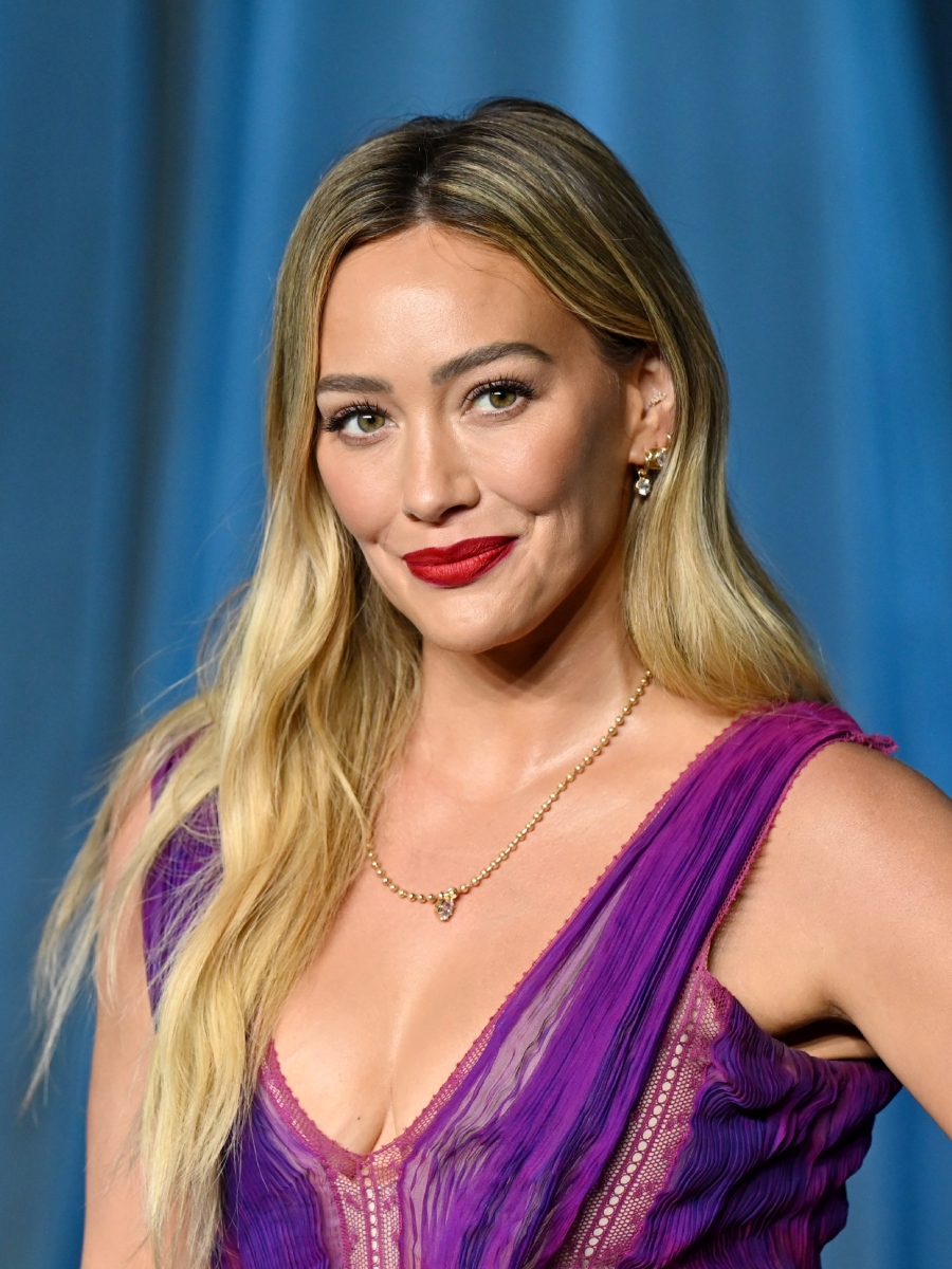 Hillary Duff: Το κόκκινο κραγιόν της δημιουργεί την τέλεια αντίθεση με την μοβ, Alberta Ferretti, δημιουργία.