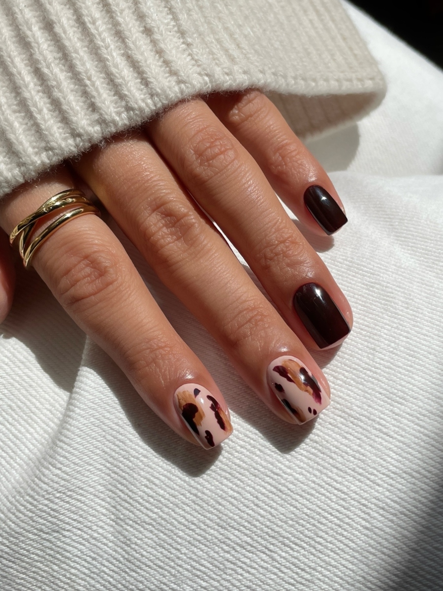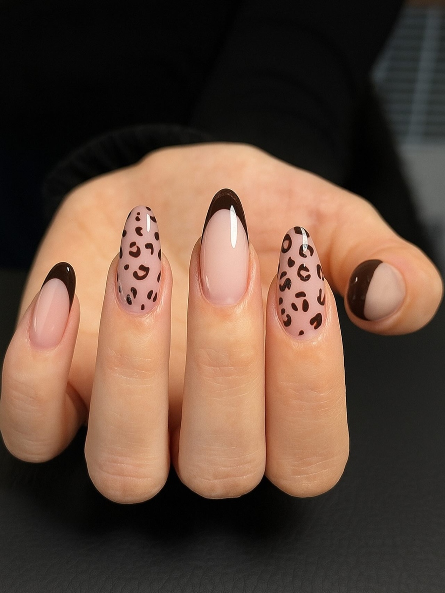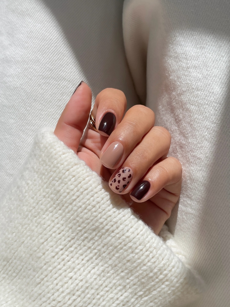 Chocolate brown tips σε τετράγωνα νύχια και animal print σε ένα μόνο.
