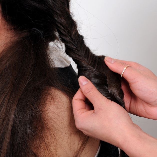 Κάναμε μια έντονη χωρίστρα στο πλάι και κρεπάραμε τα μαλλιά της. Σκοπός ήταν να δημιουργήσουμε μια ατημέλητη πλεξίδα ψαροκόκαλο στο πλάι.