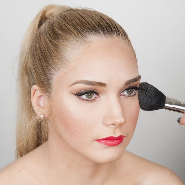 Πέρασε την πούδρα στα κόκαλα που βρίσκονται στα μάγουλά σου. Ξεκίνησε από χαμηλά και προς τα πάνω. Προσοχή: η πούδρα πρέπει να περιοριστεί σε αυτό το σημείο και να μην την περάσεις και στα μάγουλα!
