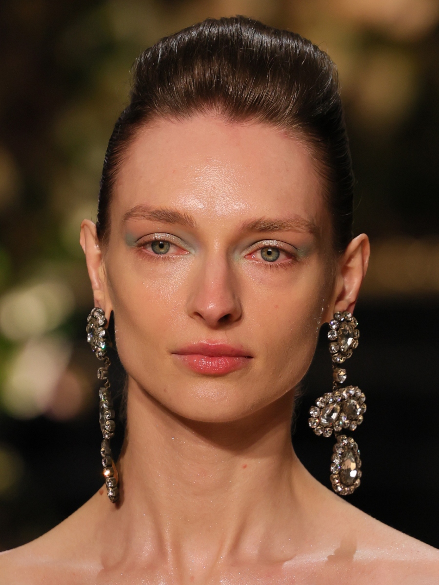 Τα beauty looks της πασαρέλας είναι εξίσου εκπληκτικά και εντυπωσιακά. Το winged eyeliner εφαρμόζεται με μοναδικό τρόπο, περιορίζοντας την ένταση μόνο στην εξωτερική και την εσωτερική γωνία των ματιών, ενώ στο κέντρο του βλεφάρου οι make up artists έχουν δημιουργήσει ένα φωτεινό shimmer εφέ που προσδίδει λάμψη και βάθος στο βλέμμα. Τα χείλη και το ντεκολτέ αναδεικνύονται με glitter, προσθέτοντας μια παιχνιδιάρικη και ταυτόχρονα εκλεπτυσμένη διάσταση στο σύνολο.