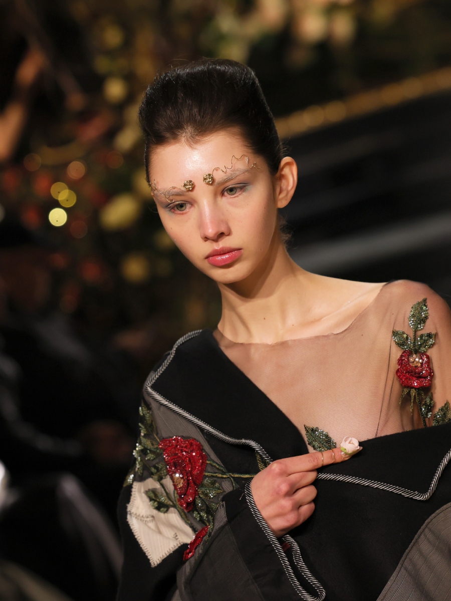 Μια λεπτομέρεια που κλέβει την παράσταση είναι τα μεταλλικά αξεσουάρ-κοσμήματα που τοποθετήθηκαν πάνω από τα φρύδια και καταλήγουν σε ένα τριαντάφυλλο, το ίδιο λουλούδι που πρωταγωνιστεί σε όλη τη συλλογή.