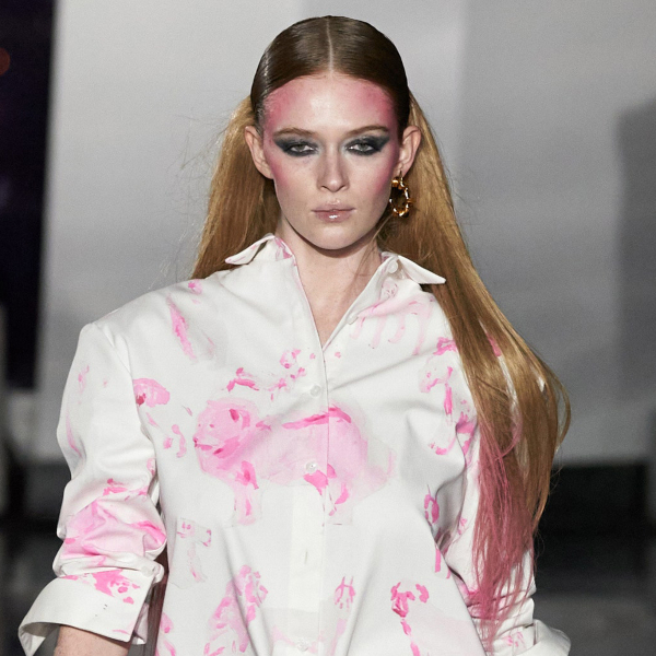 Blush: Είναι το προϊόν που πρωταγωνιστεί αλλά όχι όπως το γνώριζες μέχρι τώρα. Απλώνεται σχεδόν σε όλο το πρόσωπο δημιουργώντας μια φουτουριστική εικόνα. Ξεκινά από τα ζυγωματικά και φτάνει στα πλάγια μέρη του μετώπου και τη γέφυρα της μύτης. Στο fashion show του Christian Cowan είχε έντονο ροζ, σχεδόν κόκκινο χρώμα και συνοδεύτηκε από ένα εξίσου εντυπωσιακό, vampy βλέμμα.