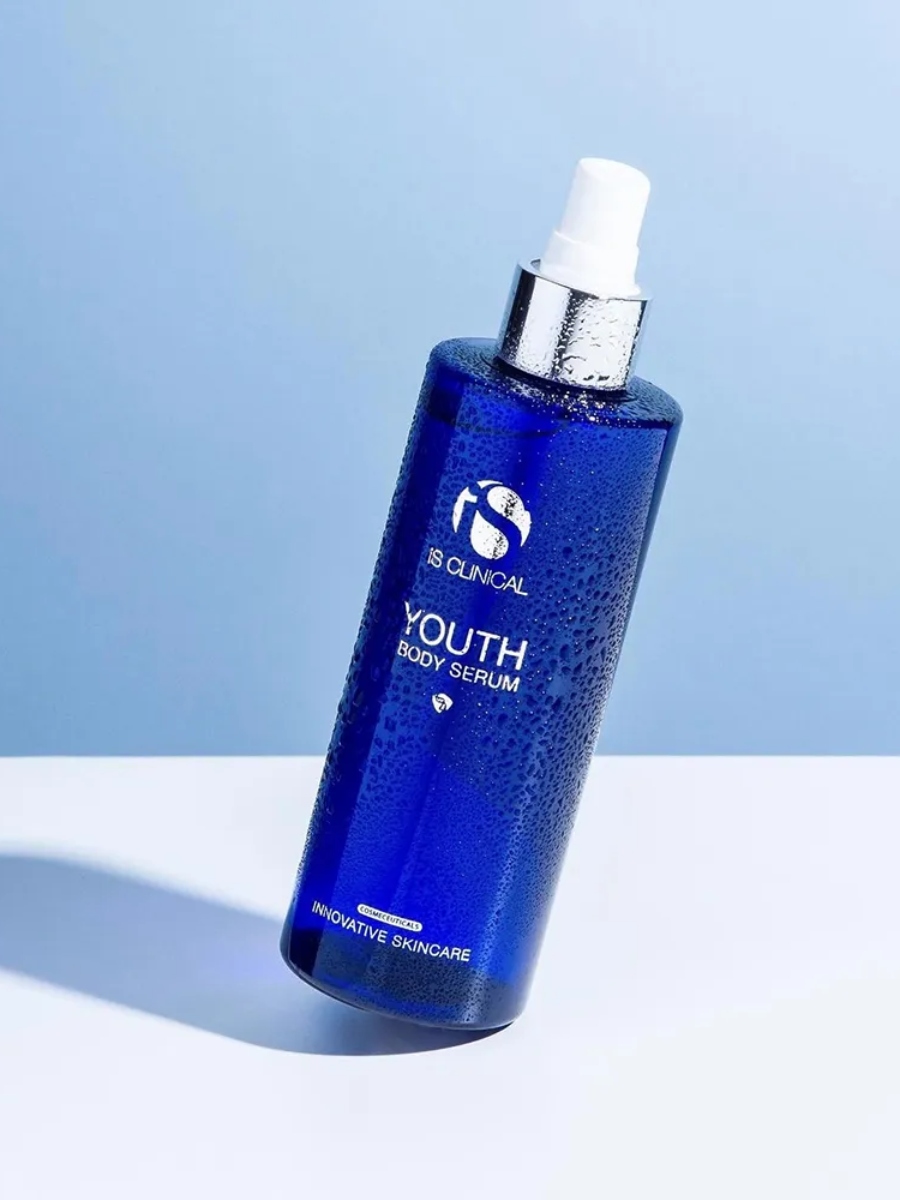 iS Clinic Youth Body Serum: Ελαφρύ mist ορού που απορροφάται απαλά από το δέρμα παρέχοντας ισχυρή ενυδάτωση και αντιοξειδωτική προστασία από περιβαλλοντικούς στρεσογόνους παράγοντες. Η πιο αγνή μορφή Υαλουρονικού Οξέος, με ισχυρό εκχύλισμα καρπουζιού, μπλε μικροφυκών, ρίζας γλυκόριζας και ιερού βοτάνου συνδυάζονται με την απαραίτητη βιταμίνη Β5 και τα ιδιόκτητα Extremozymes μας για να δημιουργήσουν μια μοναδική και αποτελεσματική φόρμουλα σχεδιασμένη ειδικά για το σώμα.
