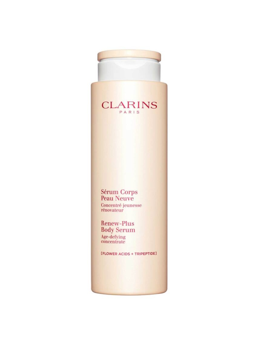 Clarins Renew-Plus Body Serum: Το αντιγηραντικό τριπεπτίδιο βοηθά στην ενίσχυση της παραγωγής κολλαγόνου και ελαστικών ινών, προάγοντας τη σύσφιξη και την ελαστικότητα της επιδερμίδας. Δρα στους δείκτες νεότητας του σώματος: κάθε μέρα, οι γραμμές λειαίνονται, το δέρμα γίνεται πιο σφριγηλό και φαίνεται πιο τονωμένο. Τα οξέα από άνθη Hibiscus sabdariffa ενισχύουν την απολέπιση της επιδερμίδας, χάρη στην περιεκτικότητά τους σε ΑΗΑ και πυροσταφυλικό οξύ φυσικής προέλευσης.