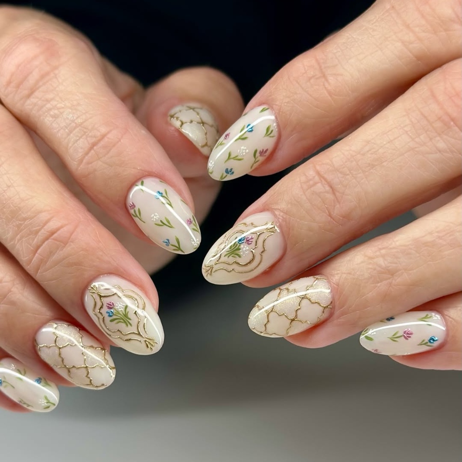 Ένα μανικιούρ που θυμίζει vintage πορσελάνες. Αν είσαι fan το Bridgerton θα το λατρέψεις.
