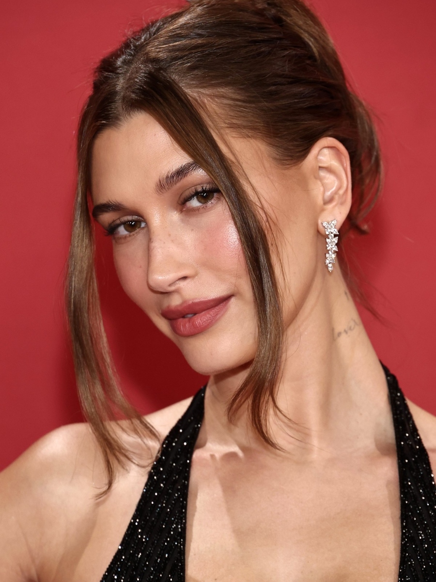 Hailey Bieber: Τα μαλλιά της είναι μαζεμένα σε ένα messy bun με τις iconic τούφες να ακουμπούν στο πρόσωπό της. Όσον αφορά στο μακιγιάζ έμεινε πιστή στο αγαπημένο της glazed με λάμψη στα ροζ ζυγωματικά της και γήινες αποχρώσεις στα μάτια.