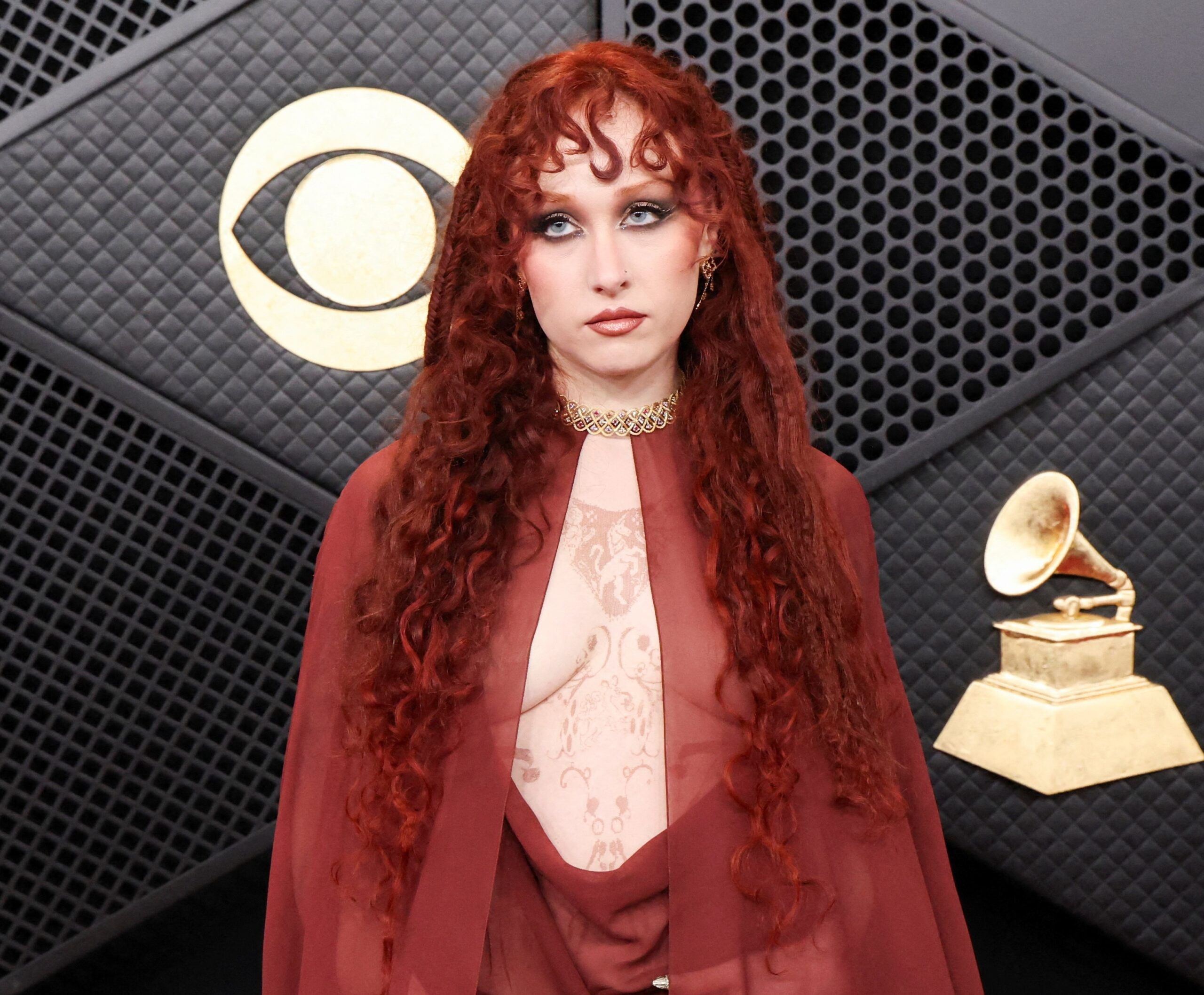 Από πού να αρχίσει κανείς με το red carpet look της Chappell Roan; Ας επικεντρωθούμε όμως στο breathtaking χτένισμά της. Τα μακριά curly μαλλιά της ήταν matchy matchy με το κόκκινο φόρεμά της και οι σγουρές αφέλειες της πλαισίωναν έντονα τα μάτια που κινήθηκαν σε γκρι αποχρώσεις του γκρι. Ο makeup artist Andrew Dahling δημιούργησε επίσης το τέλειο χρώμα χειλιών για να συνοδεύσει το αέρινο φόρεμά της, με έναν επιδέξιο συνδυασμό από MAC Powder Kiss Lip + Cheek Mousse στις αποχρώσεις Velvet Teddy και Fashion Emergency, Dazzelips Crayon στο Chandelier και μολύβια χειλιών στις αποχρώσεις Plum και Auburn.