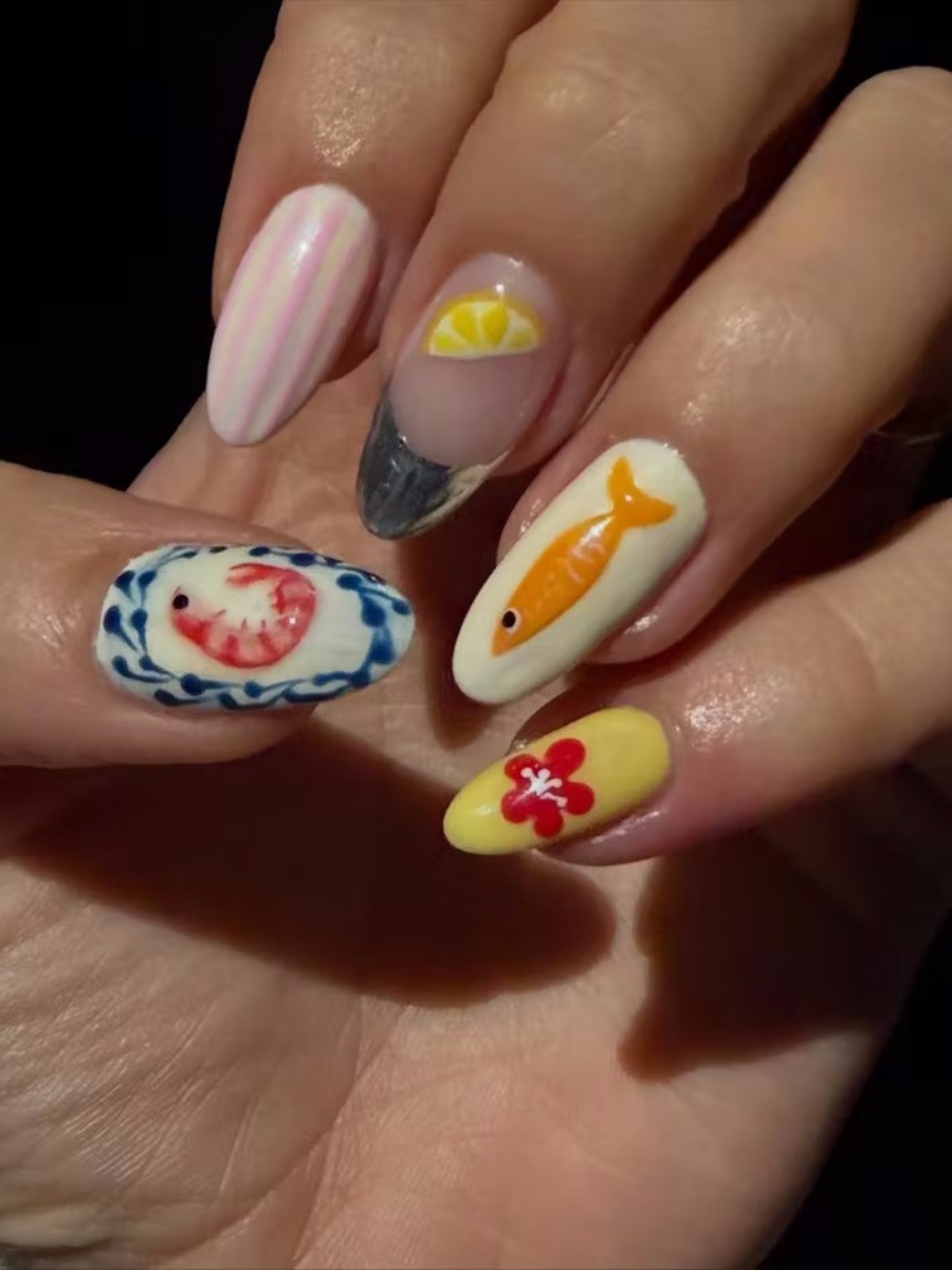 Ωστόσο, αυτό που ξεχώρισε περισσότερο στις φωτογραφίες ήταν το μανικιούρ της. Αν και η Bieber είναι γνωστή για τα κομψά και minimal νύχια της, αυτή τη φορά ζήτησε από τη γνωστή nail artist Zola Ganzorigt να δημιουργήσει ένα μανικιούρ με θέμα το «seafood palette», εμπνευσμένο από τα χρώματα και τις αποχρώσεις της θάλασσας και των θαλασσινών.