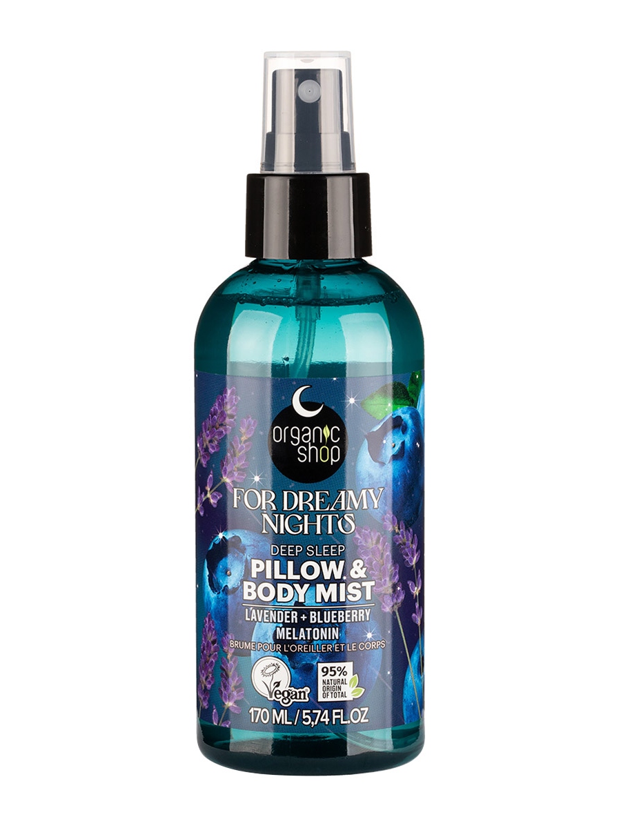 Organic Shop Pillow & Body Mist Lavender + Blueberry Melatonin: Με αιθέριο έλαιο λεβάντας, εκχύλισμα blueberry και μελατονίνη δρα φυσικά για να ηρεμήσει τις αισθήσεις και να υποστηρίξει τη διαδικασία χαλάρωσης του σώματος. Το έλαιο λεβάντας είναι γνωστό για τις καταπραϋντικές και αγχολυτικές του ιδιότητες, μειώνοντας το στρες και βοηθώντας στην εξισορρόπηση του νευρικού συστήματος. Το blueberry, πλούσιο σε αντιοξειδωτικά, αναζωογονεί και φροντίζει την επιδερμίδα, ενώ η μελατονίνη συμβάλλει φυσικά στη ρύθμιση του ύπνου, προάγοντας έναν βαθύ, ξεκούραστο ύπνο.