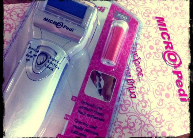 Λοιπόν, λοιπόν! Το συγκεκριμένο beauty gadget είναι για τις σκληρύνσεις στις φτέρνες, το βρίσκεις αποκλειστικά στα καταστήματα Κωτσόβολος και το ζητάς σαν Micro Pedi. Στην συσκευασία υπάρχουν δύο κεφαλές: η μπλε και η ροζ. Η μπλε είναι για τις πολύ τραχές φτέρνες και η ροζ για τις κανονικές σκληρύνσεις.
