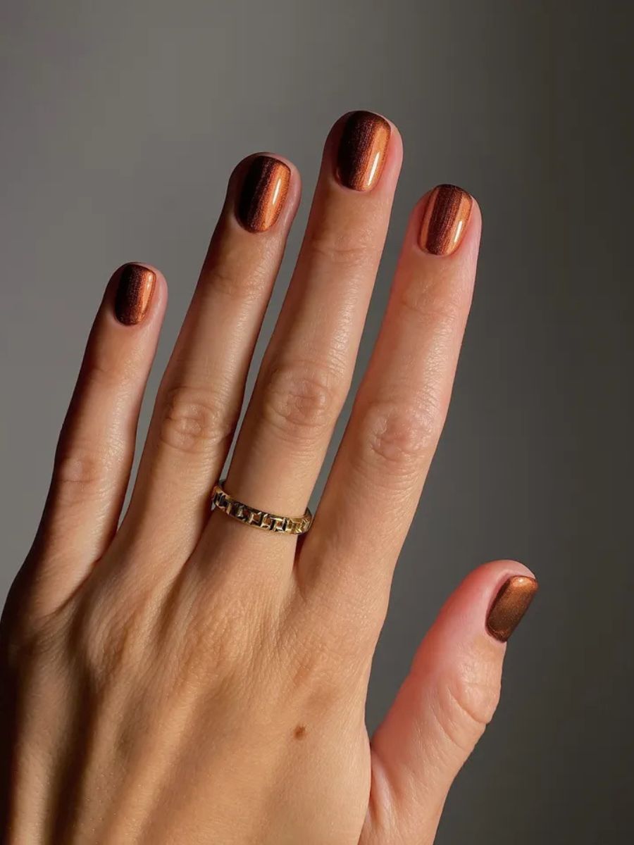 Αυτή η απόχρωση της κανέλας είναι απλώς υπέροχη απόδειξη ότι τα κοντά νύχια κάθε άλλο παρά βαρετά είναι αυτόν τον χειμώνα.