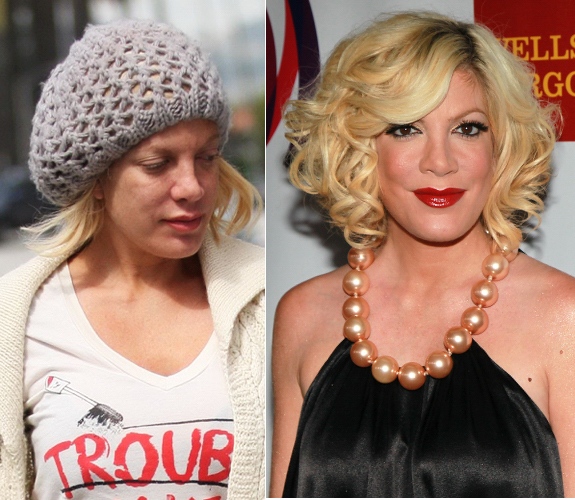 Η Tori Spelling έχει απαθανατιστεί πολλές φορές χωρίς ίχνος μακιγιάζ. Την προτιμάμε σαφώς μακιγιαρισμένη. Τα κόκκινα χείλη της δίνουν πόντους glam ενώ το ρουζ και το make up κάνουν το πρόσωπό τους να δείχνει ξεκούραστο.