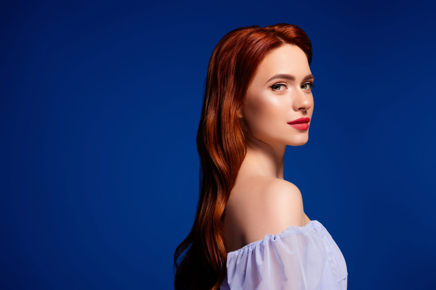 Striking portrait of a beautiful young woman with vibrant red hair against a vivid blue background, emphasizing beauty, confidence, and fashion