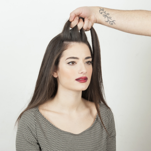 Συνέχισε κατά τον ίδιο τρόπο σε όλο το μήκος παίρνοντας τις επόμενες τούφες από τα πλαϊνά και περνώντας κατά τον ίδιο τρόπο την δεξιά τούφα κάτω από τη μεσαία