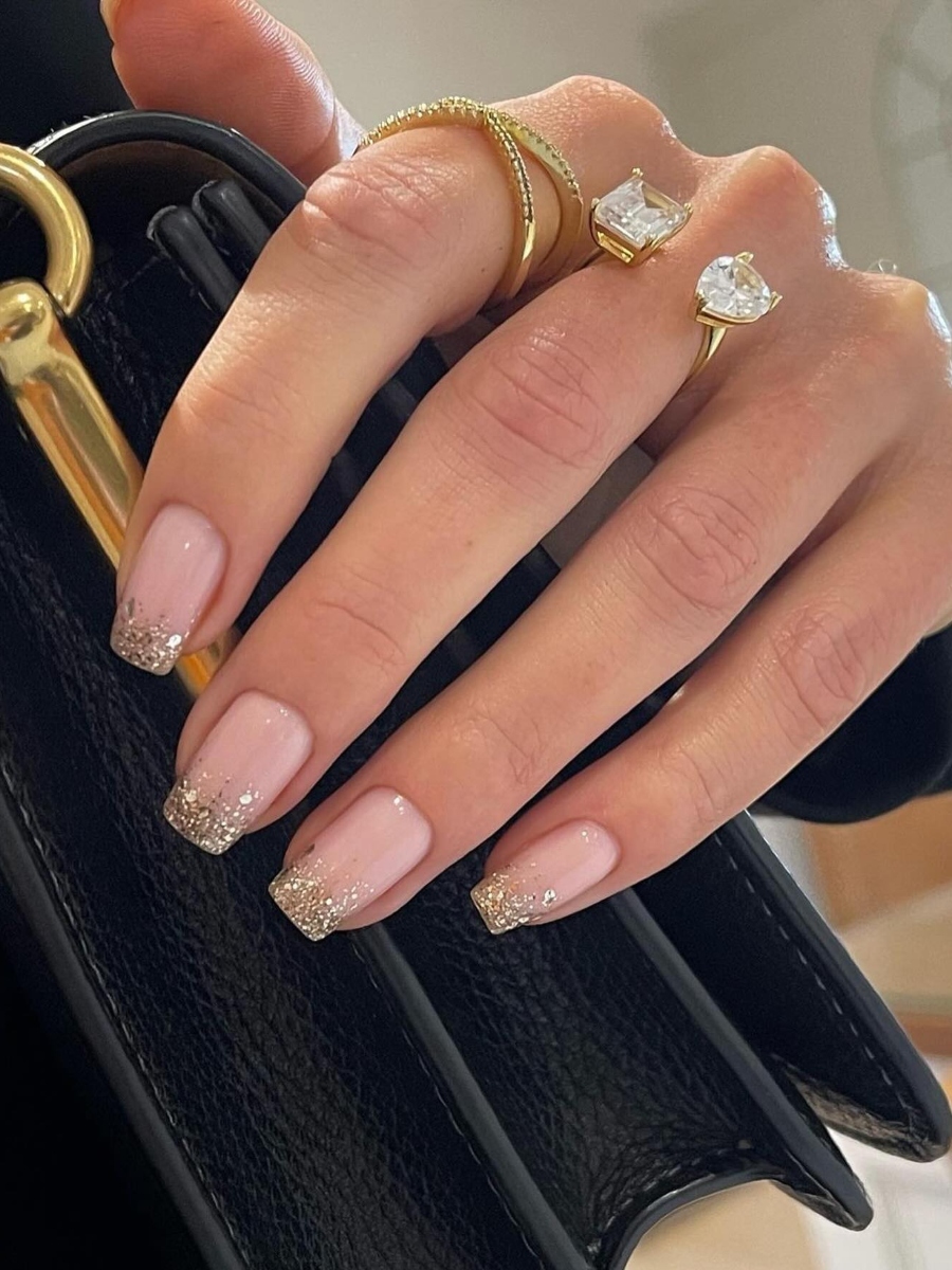 Η βάση είναι διάφανη και το χρυσό glitter είναι ανεπιτήδευτα απλωμένο στα tips.