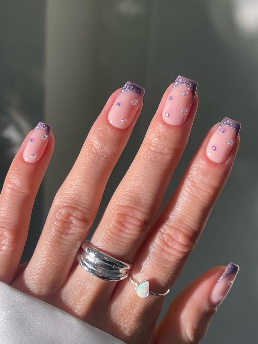 Lavender glitter στα tips και μικροσκοπικά κρύσταλλα στη διάφανη βάση.