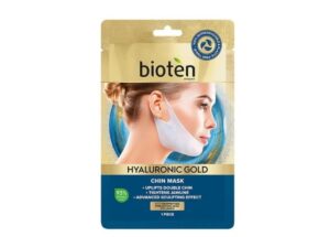 Hyaluronic Gold Chin Mask, Bioten. Mε 93% συστατικά φυσικής προέλευσης, η μάσκα λαιμού της Bioten, είναι εμπλουτισμένη με Εξαπεπτίδιο, Υαλουρονικό Οξύ και Κολλαγόνο που βοηθούν στη σμίλευση και τόνωση πηγουνιού και λαιμού. Η ισχυρή της σύνθεση βοηθά στη μείωση της χαλάρωσης της επιδερμίδας ενώ συσφίγγει την περιοχή του λαιμού. Στοχεύει στις γραμμές του πηγουνιού και του λαιμού δίνοντας εφέ lifting.