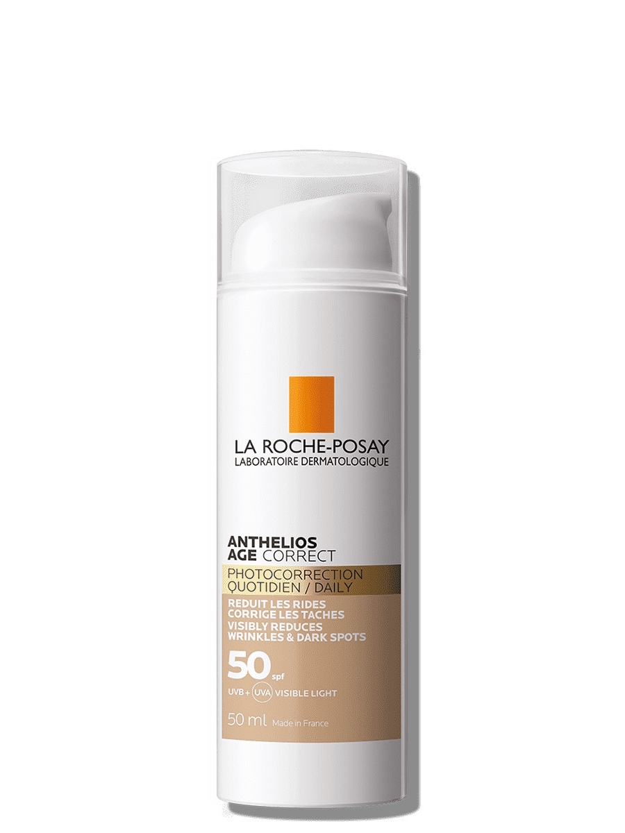 La Roche Posay Anthelios Age Correct 50 SPF: Προσφέρει υψηλή προστασία από τις ακτίνες UVA και UVB ενώ ταυτόχρονα λειαίνει τα πρώτα σημάδια γήρανσης. Η ανάλαφρη υφή της δεν βαραίνει το δέρμα και χάρη στο χρώμα της, προσφέρει ομοιόμορφο αποτέλεσμα και φυσική λάμψη, σαν να φοράτε ένα ελαφρύ μακιγιάζ.