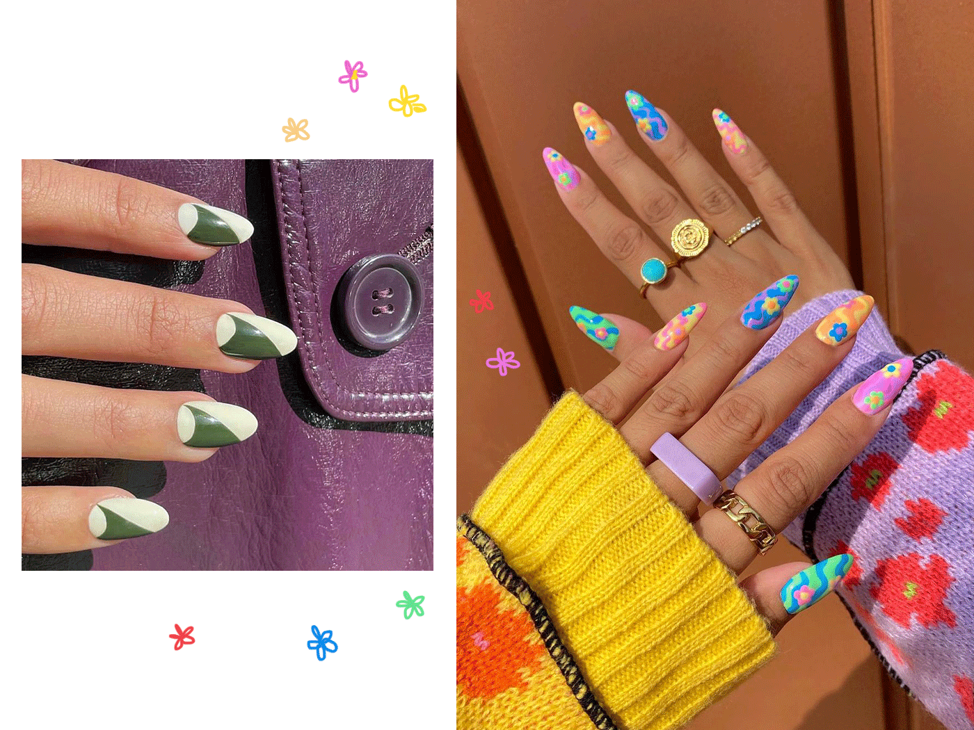 Abstract & Floral: Αν θέλεις να συνδυάσεις τα 70’s nail trends επιλέγεις τα δύο μεγαλύτερα. Λουλούδια και κυματισμούς σε γήινες αποχρώσεις.