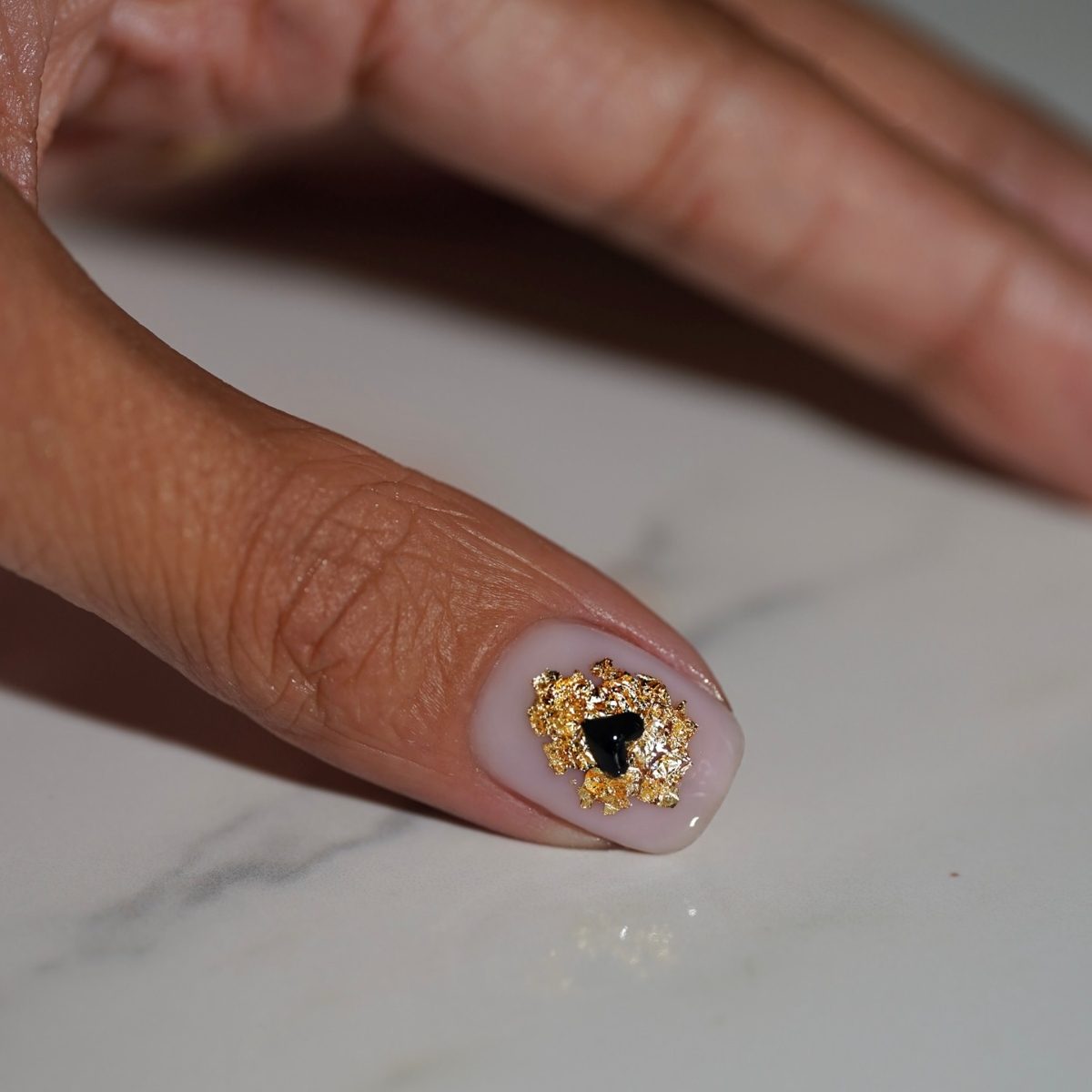 Glam chic. Η βάση είναι λευκή και ο αντίχειρας στολίζεται με φύλλα χρυσού και μια μικρή, μαύρη καρδιά.
