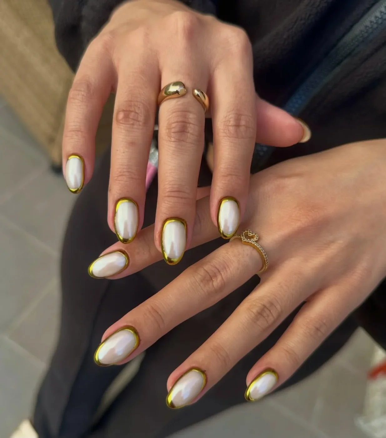 Το χρυσό γίνεται απόλυτο statement το 2026 και το συγκεκριμένο είναι μαξιμαλιστικό με 3D λεπτομέρειες όπως molten gold εφέ που αναβαθμίζει τις ουδέτερες ή διάφανες βάσεις. Για να συνδυάσεις την τάση με το pearl mani κάθε νύχι έχει ένα μεταλλικό χρυσό περίγραμμα για εντυπωσιακό και πολυτελές αποτέλεσμα.