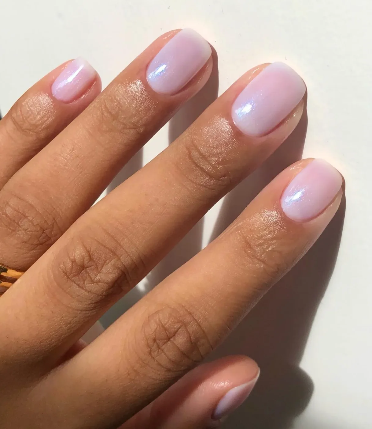Ένας τέλειος συνδυασμός τάσεων: αυτό το απλό look ενώνει τα lavender milk nails, τα BB cream nails και τα pearl nails σε ένα super λαμπερό αποτέλεσμα. Για να πετύχεις την απόχρωση που κολακεύει όλους, επίλεξε μια ημιδιάφανη λιλά βάση και ένα top coat με μωβ ιριδίζουσα λάμψη.