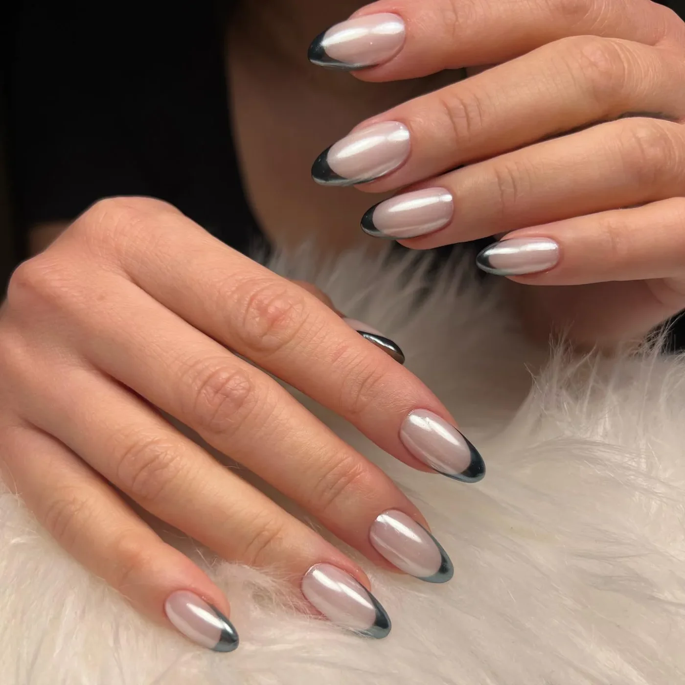 Για μια πιο μοντέρνα εκδοχή του κλασικού pearly French, επιλέγεις μια milky βάση, σκούρες άκρες και ένα περλέ chrome powder από πάνω. Είναι ο τέλειος τρόπος να «μαλακώσεις» ένα ασπρόμαυρο μανικιούρ, διατηρώντας παράλληλα ένα έντονο, fashion-forward αποτέλεσμα.