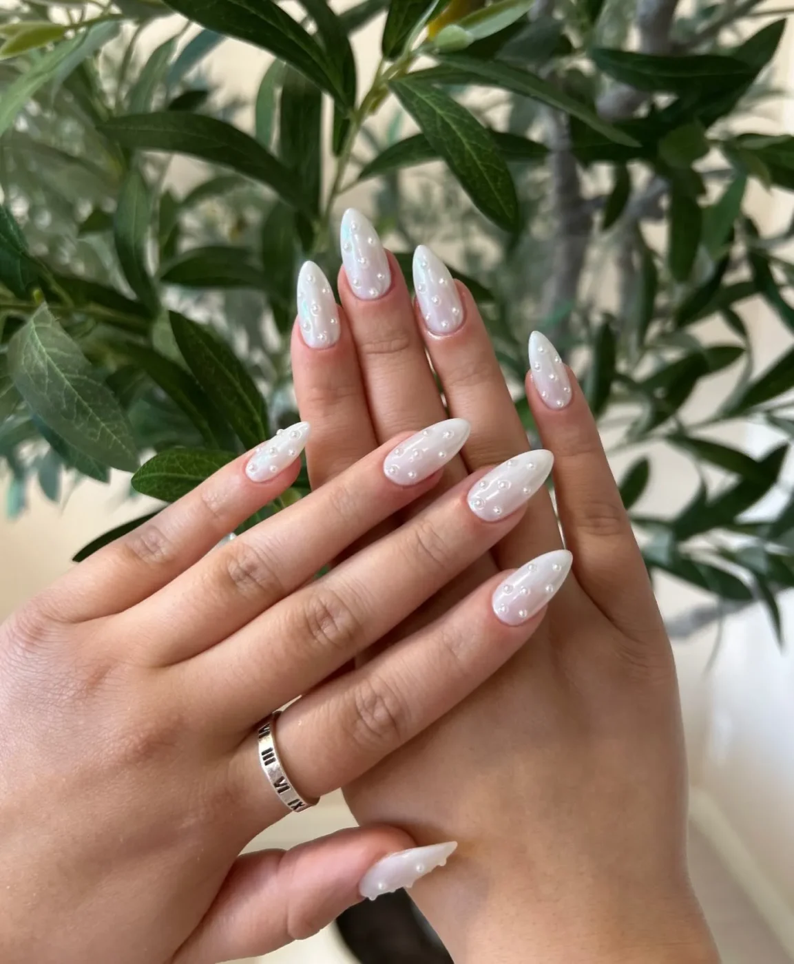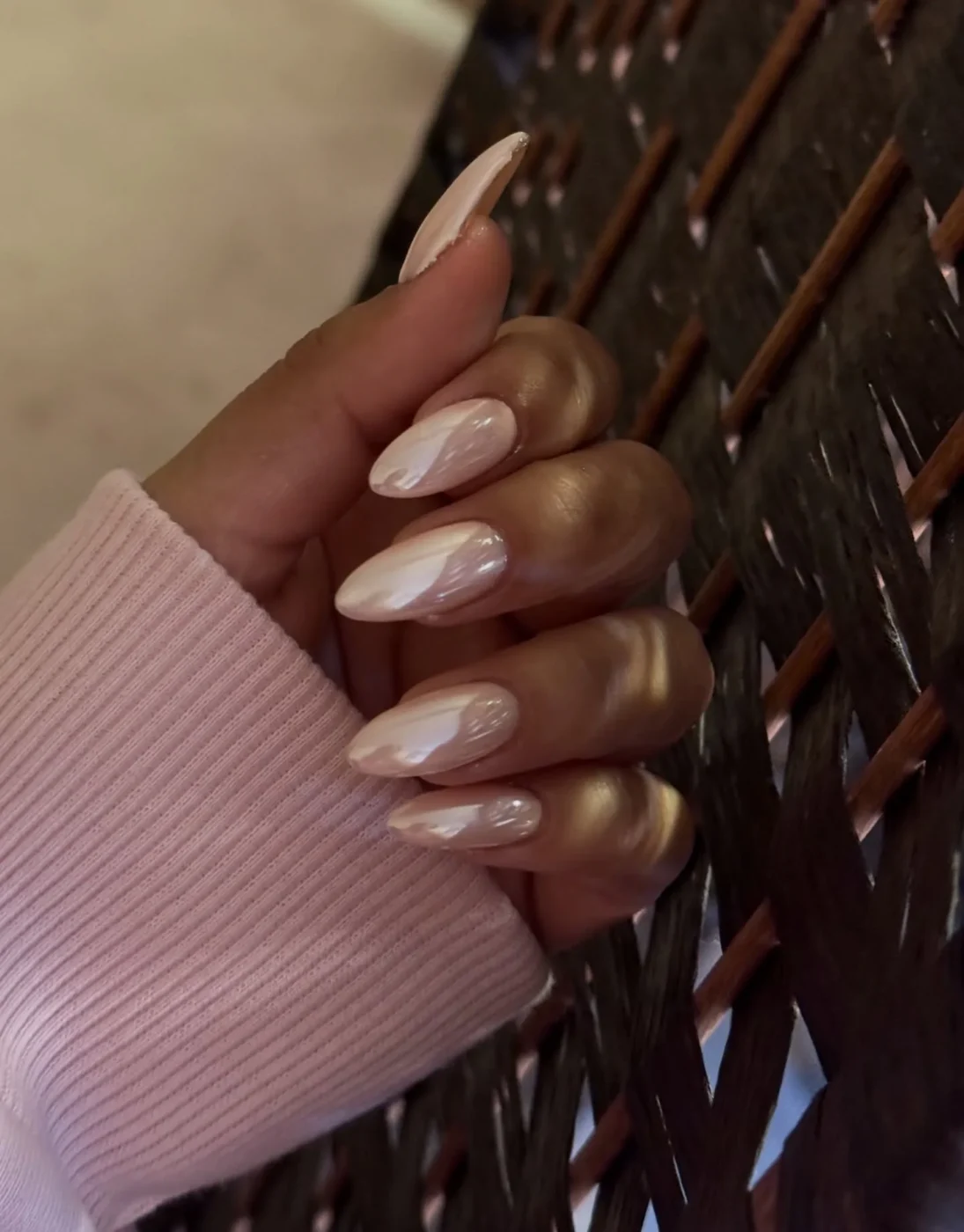 Για ένα διαχρονικό pearl nail look, η βάση είναι milky με περλέ chrome φινίρισμα. Απαλό και διακριτικό, αντανακλά όμορφα το φως και προσαρμόζεται εύκολα με όλα τα outfits.