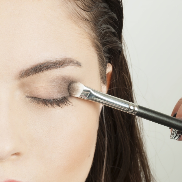 Ξεκίνησε με μια καφέ ματ σκιά στην εξωτερική γωνία. Βάλε την σκιά στο πινελάκι σου και τοποθέτησέ το στο σημείο που τελειώνει η εξωτερική γωνία του ματιού σου και μέχρι το κόκκαλο.
