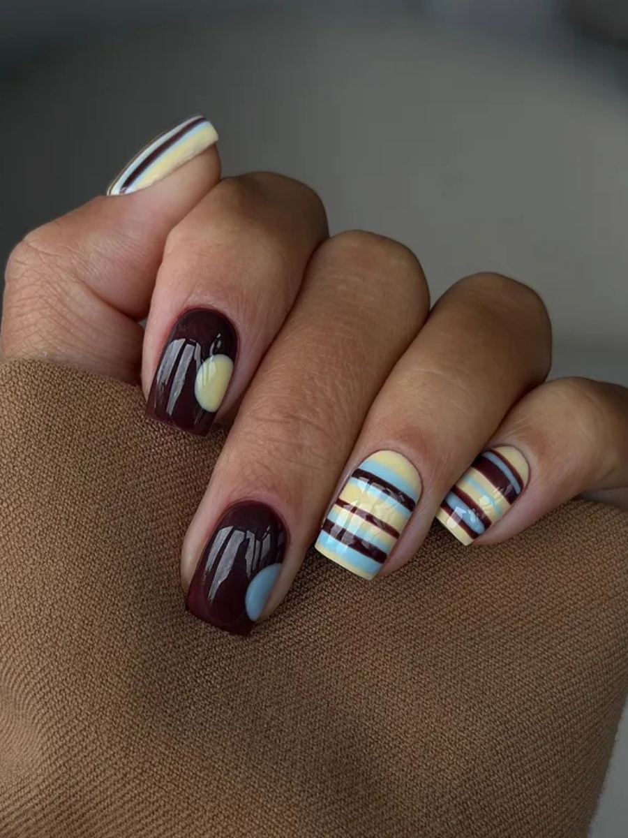 Η nail artist Stephanie Holland πειραματίστηκε συνδυάζοντας το καφέ με butter yellow και baby blue σε αυτό το look που ολοκληρώνεται με ασύμμετρα prints χαρίζοντας μια αίσθηση vintage νοσταλγίας.
