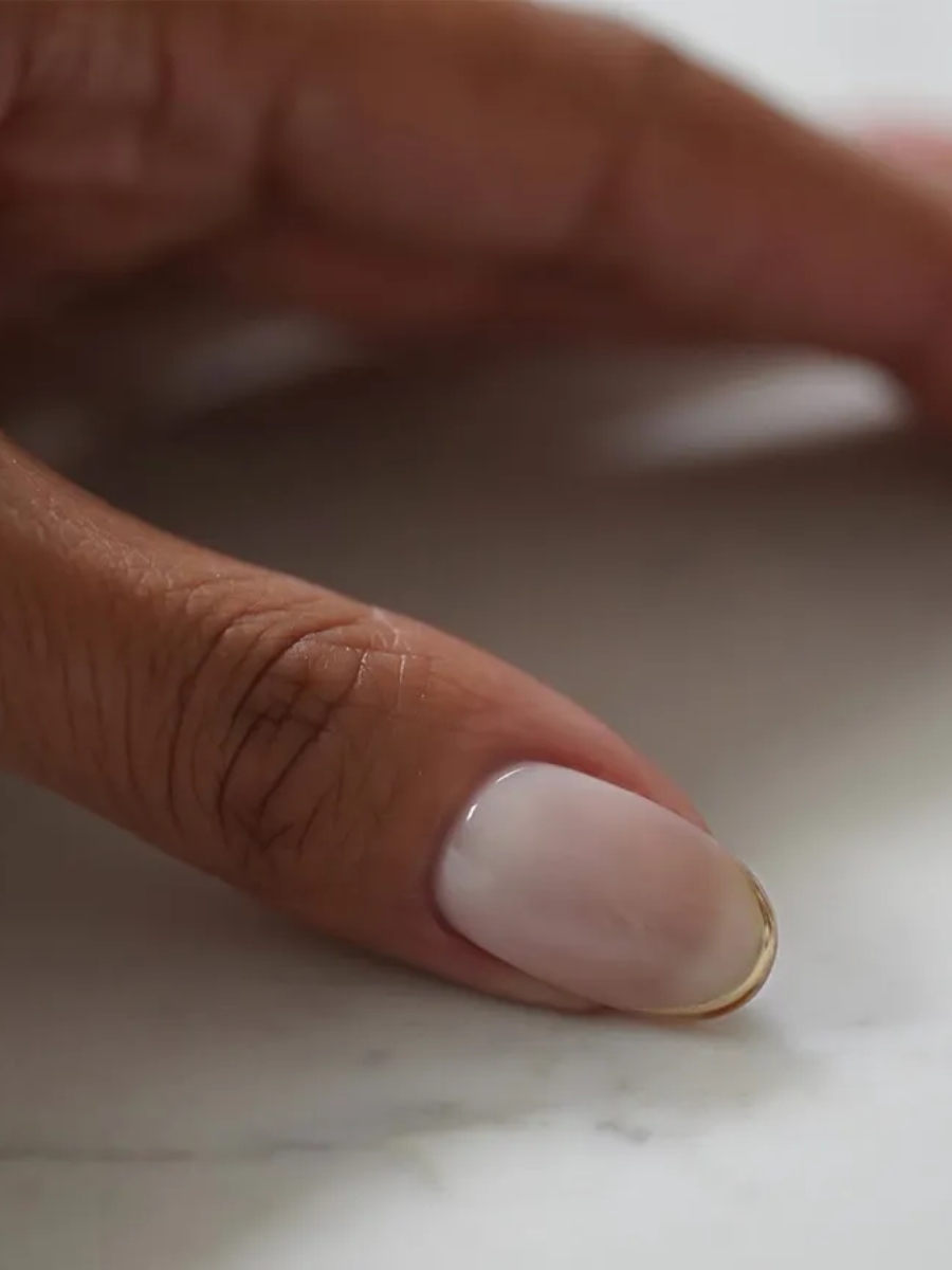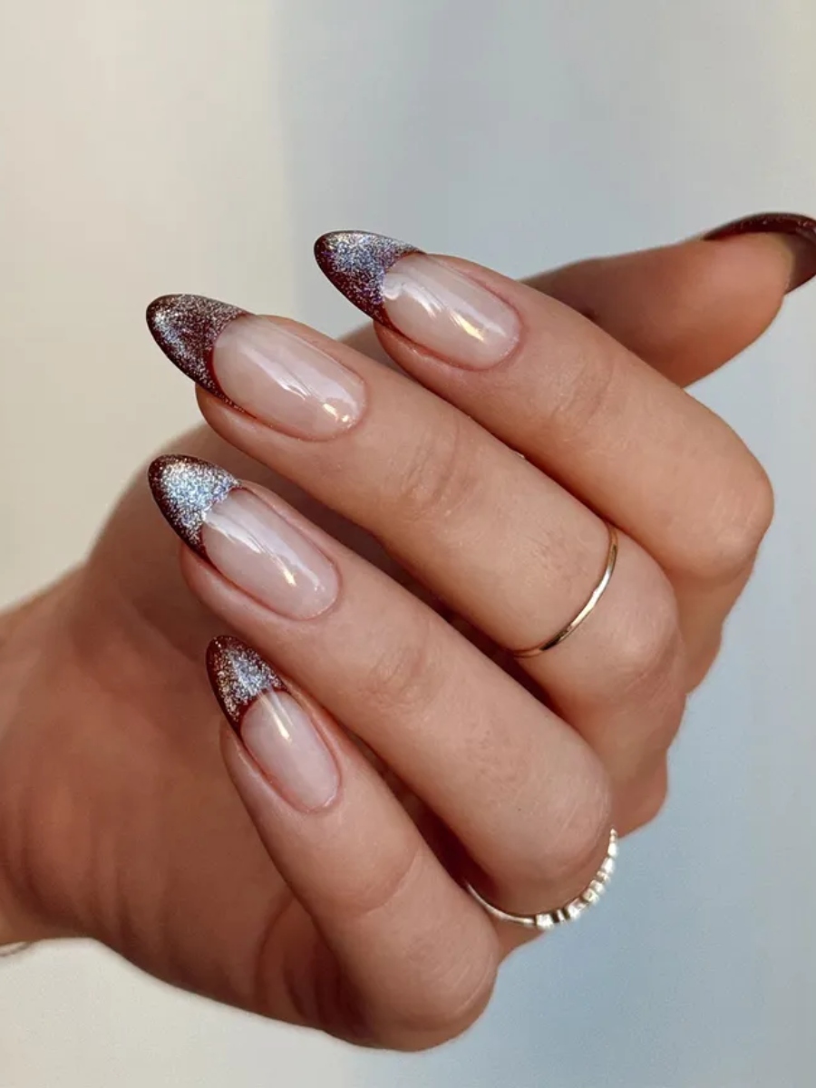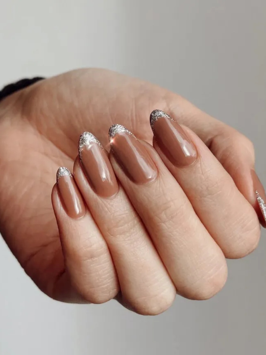 Μicro-French manicure που συνδυάζει ένα ζεστό latte χρώμα με ασημί shimmer στις άκρες, προσφέροντας μια μοντέρνα εκδοχή του κλασικού French-inspired nail design. Το αποτέλεσμα είναι καθαρό, κομψό και με μια διακριτική πινελιά glam.