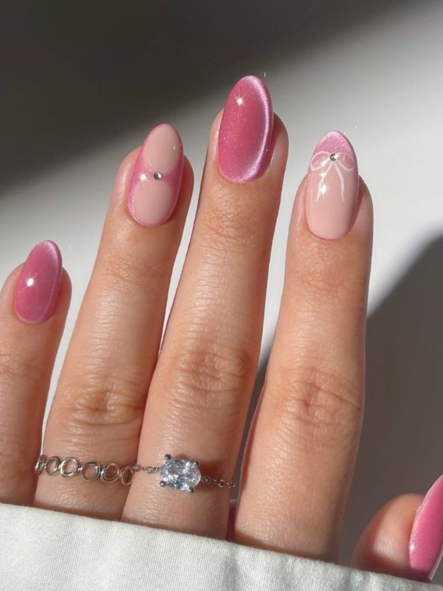 Για την ημέρα του Αγίου Βαλεντίνου δεν είναι απαραίτητες οι καρδιές στο nail art. Συνδύασε ένα ροζ chrome βερνίκι με λευκούς, λεπτεπίλεπτους φιόγκους διακοσμημένους με στρας.