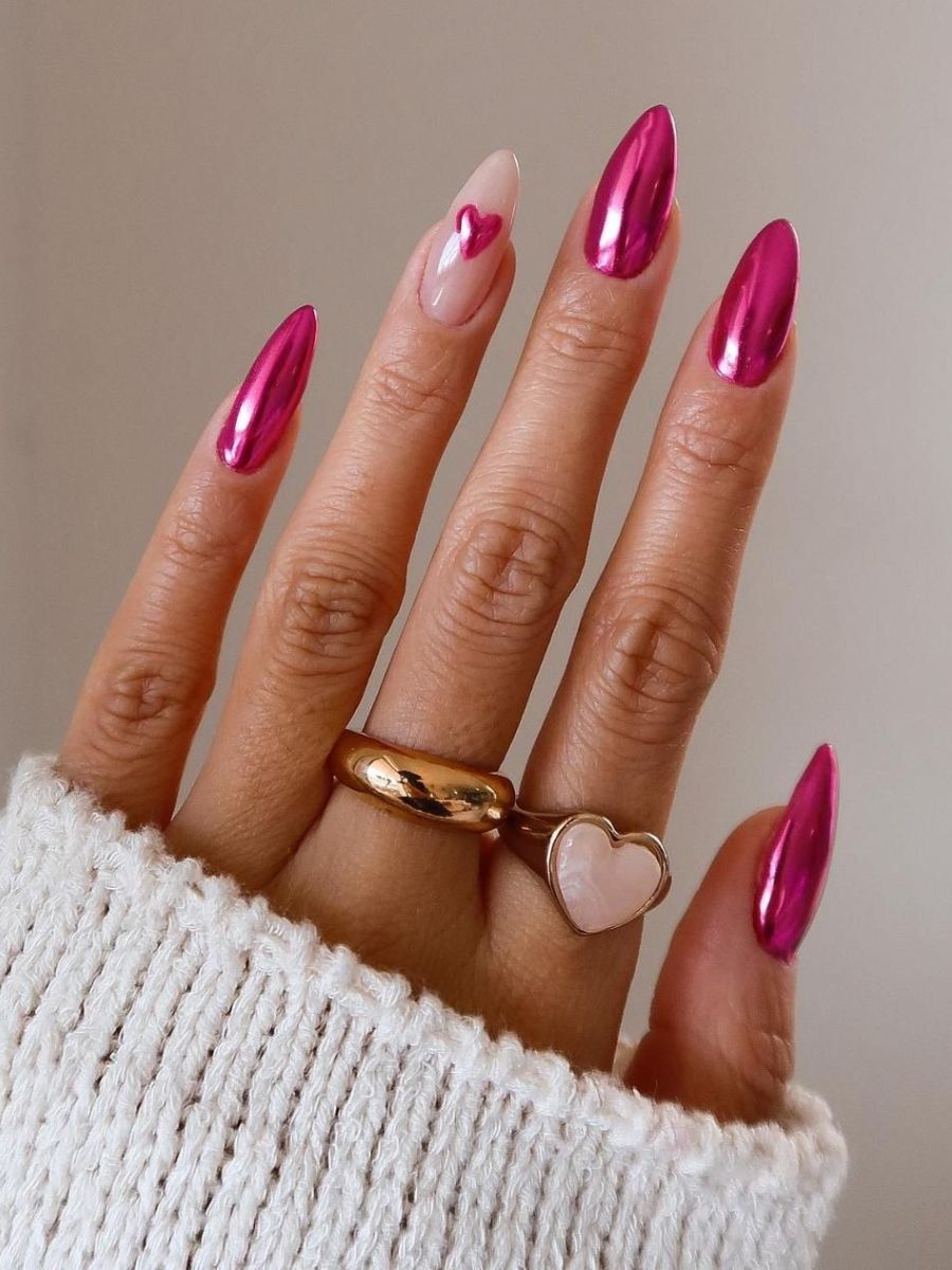 Αν είσαι extra, αυτό το μανικιούρ είναι προορισμένο για εσένα. Bold, λαμπερό και σε Valentine’s Day mood. Άσε ένα νύχι nude και σχεδίασε με το ίδιο βερνίκι μια φούξια chrome καρδιά για μια extra αγαπησιάρικη πινελιά.