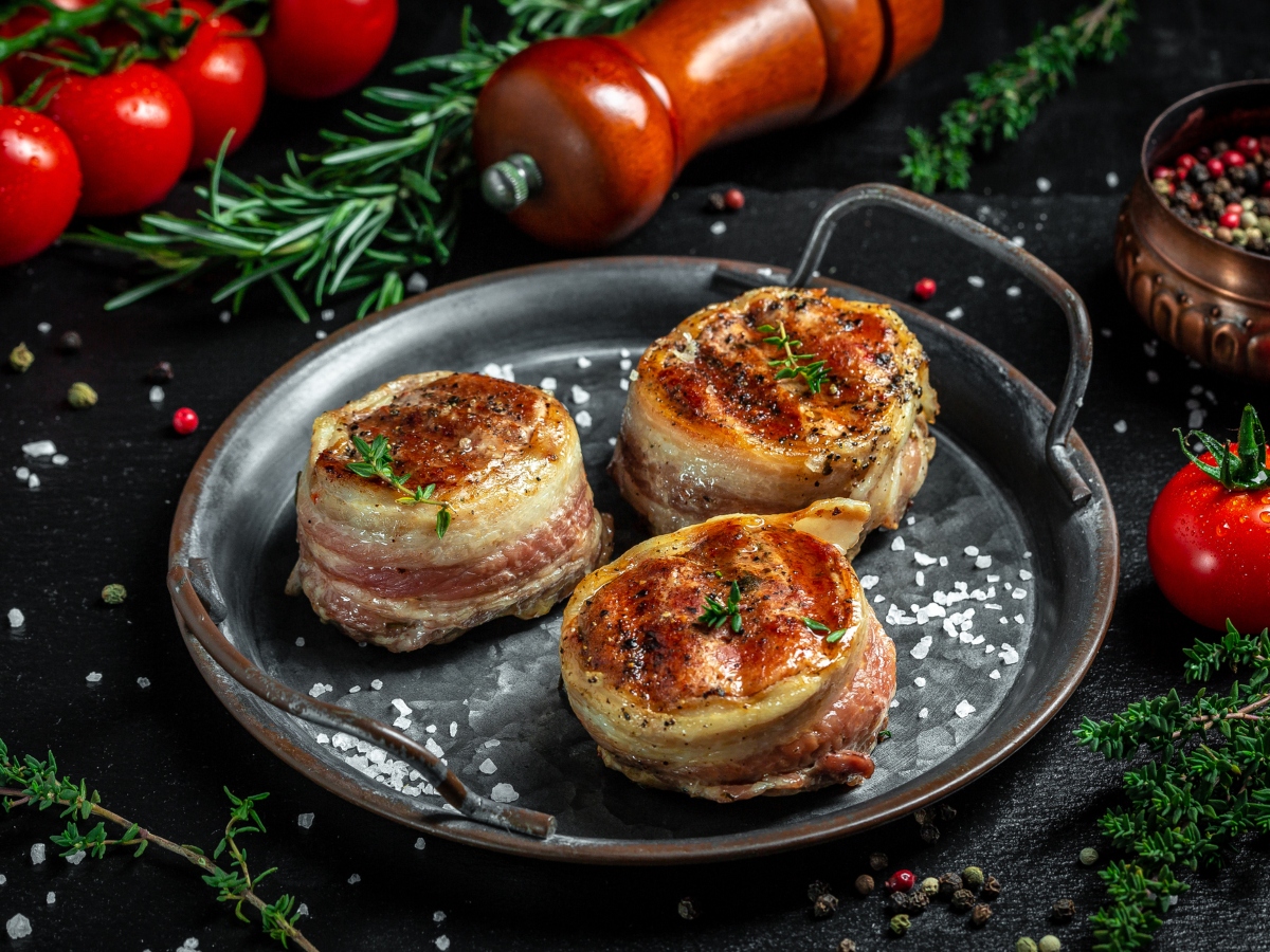 - Απλώνεις τα φιλέτα μινιόν και τα αλατοπιπερώνεις ελαφρά και από τις δύο πλευρές. Τυλίγεις τα φιλέτα σου με τις φέτες μπέικον και τα μεταφέρεις σε ένα καθαρό πιάτο.
