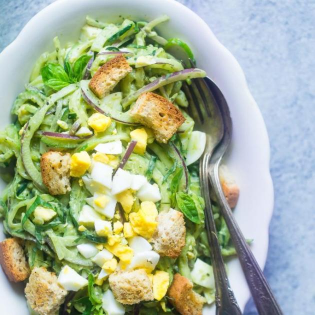 - Πρόσθεσε τα αυγά, τα κολοκυθάκια, το κρεμμύδι, το αλάτι, το βασιλικό, το πέστο και τα κρουτόν σε ένα μπολ και ανακάτεψε τη σαλάτα.