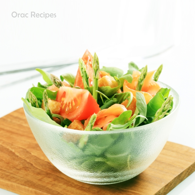 • Κόβουμε το σολομό σε λεπτές μακρόστενες λωρίδες και τον προσθέτουμε στη σαλάτα